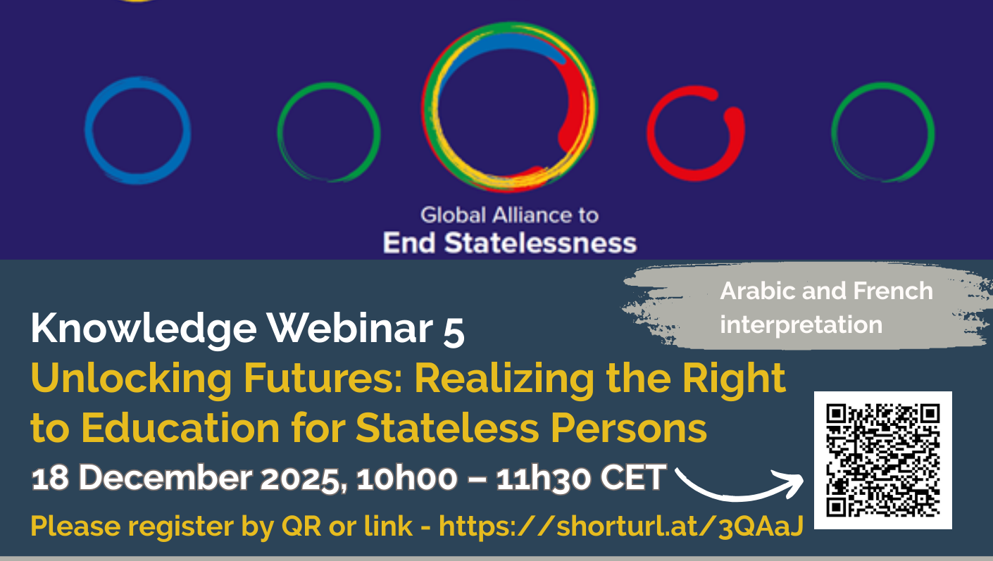The fifth session, Unlocking Futures: Realizing the Right to Education for Stateless Persons, is organized by the respective Global Alliance Thematic Working Group and will take place on 18 December 2025, 10h00 – 11h30 CET. It will serve to commemorate Human Rights Day on 10 December, underscoring the right to education as a core human right that must be guaranteed for all, including stateless persons. The webinar will bring together States, civil society, stateless-led organizations and partners to showcase good practices and spark collaborative efforts to ensure that no stateless person is left behind.