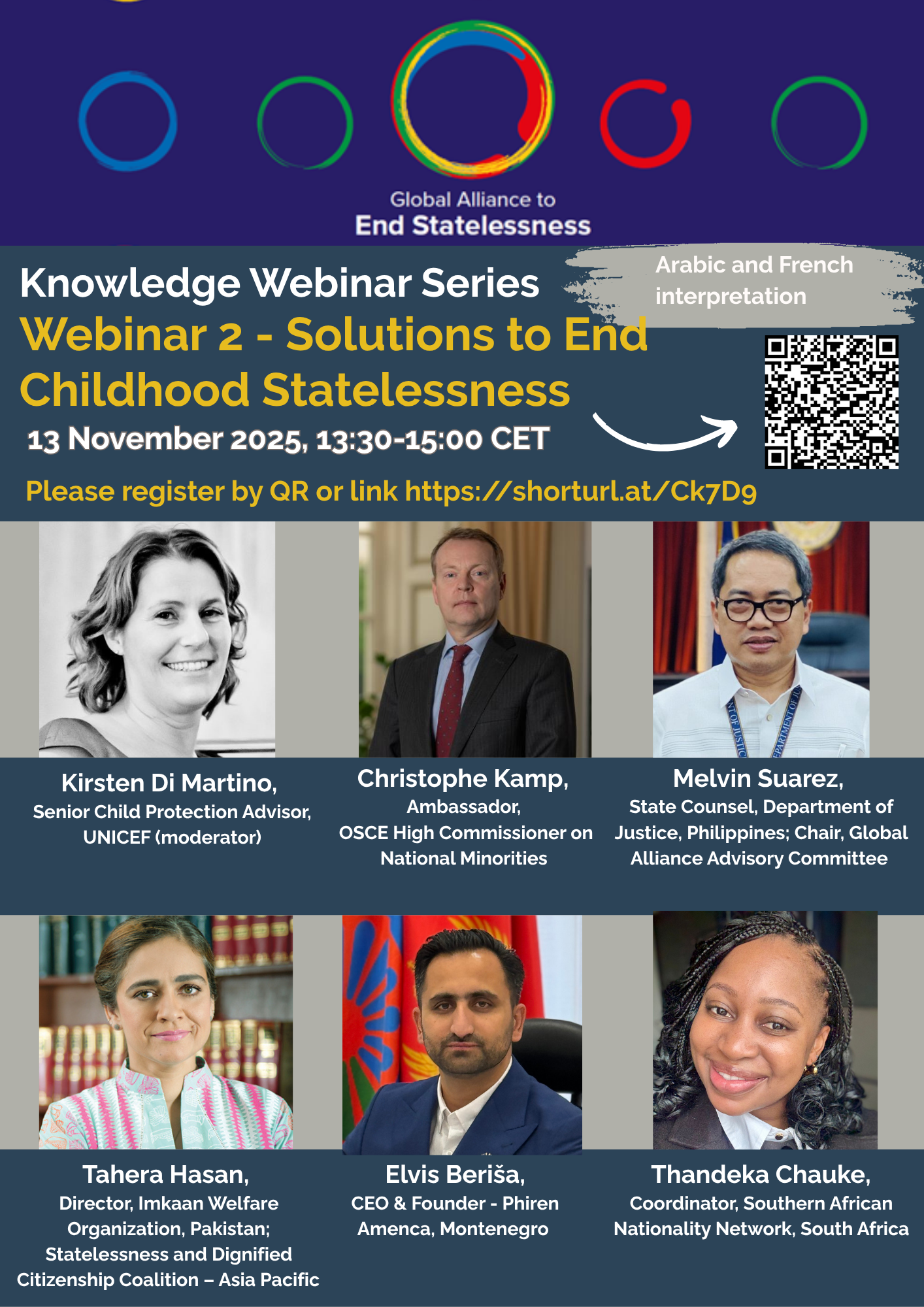 The Global Alliance to End Statelessness held its second Knowledge Webinar on 13 November, focusing on “Solutions to End Childhood Statelessness.” Childhood statelessness remains one of the most pressing issue, widely recognized by Global Alliance members and stakeholders as requiring intensified action, with governments carrying a clear legal and moral obligation under the Convention on the Rights of the Child (CRC) to ensure that every child acquires a nationality at birth or as early as possible.