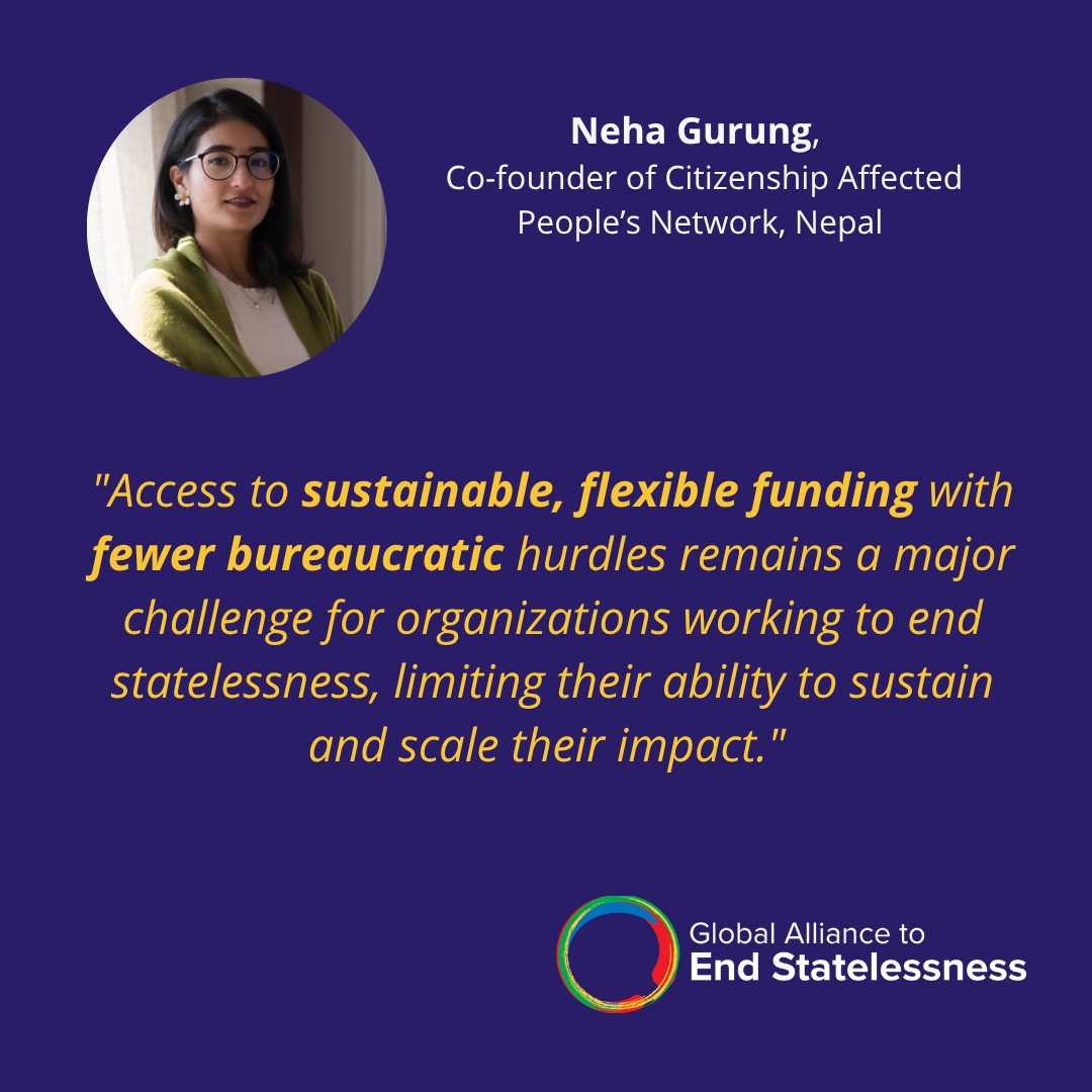 On 20 November 2025, Neha Gurung, Co-founder of the Citizenship Affected People’s Network in Nepal, moderated the Global Alliance Knowledge Webinar #3 titled Fundraising for Impact: Mobilizing Resources to End Statelessness, during which she welcomed a series of expert speakers with direct, hands-on experience in fundraising for statelessness. The discussion identified practical strategies that civil society and stateless-led organizations, as well as other stakeholders, can implement to navigate these constraints and sustain progress toward ending statelessness.