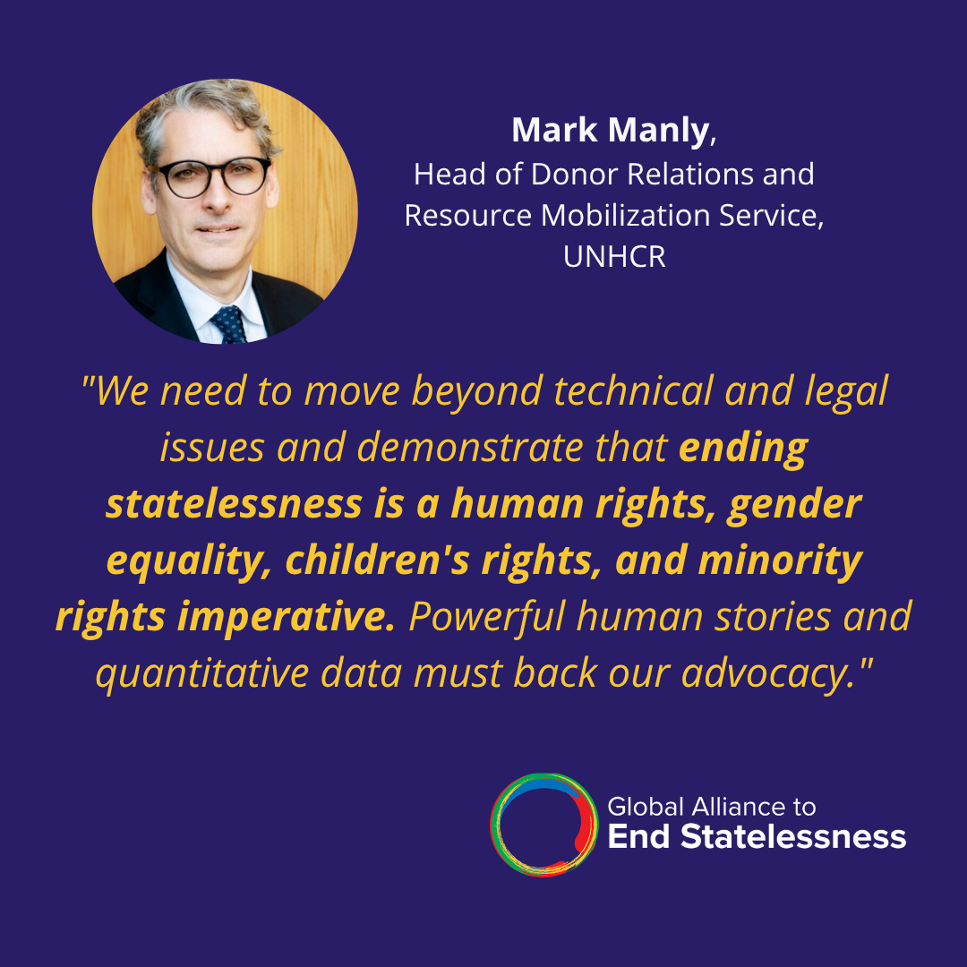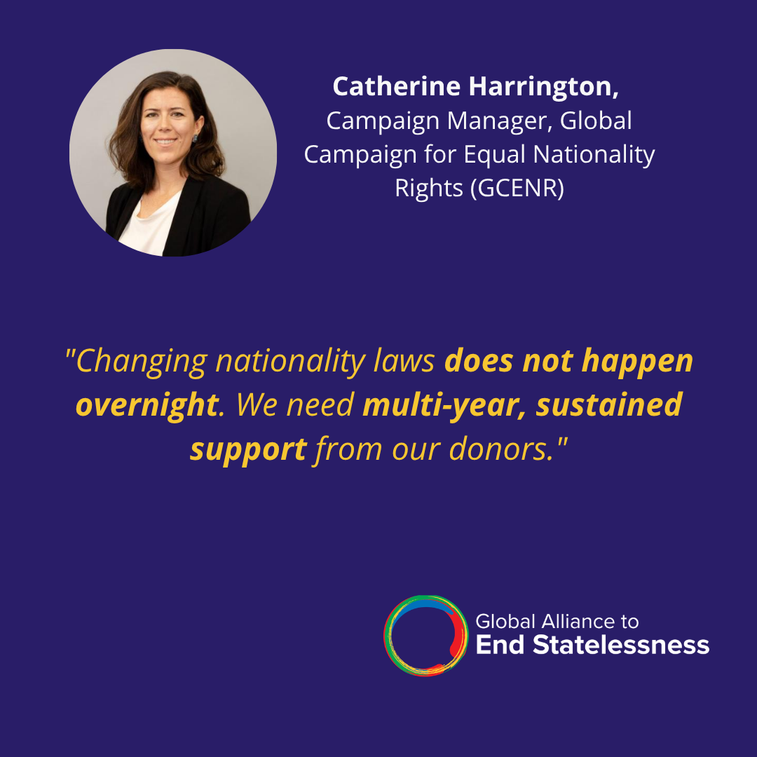 Catherine Harrington, Campaign Manager of the Global Campaign for Equal Nationality Rights (GCENR), highlighted the importance of demonstrating to donors why efforts to combat statelessness and advance equal nationality rights are critical to realizing global goals, including sustainable development and nondiscrimination. By convening multi-stakeholder summits and facilitating collaboration among governments, civil society, and UN agencies, the campaign showcases how nationality rights advocacy drives support for the principle of equal citizenship. Catherine noted that donors often lack awareness of the importance of equal nationality rights; showing how reforms advance broader donor priorities – such as gender equality and children’s rights – is key to securing support.