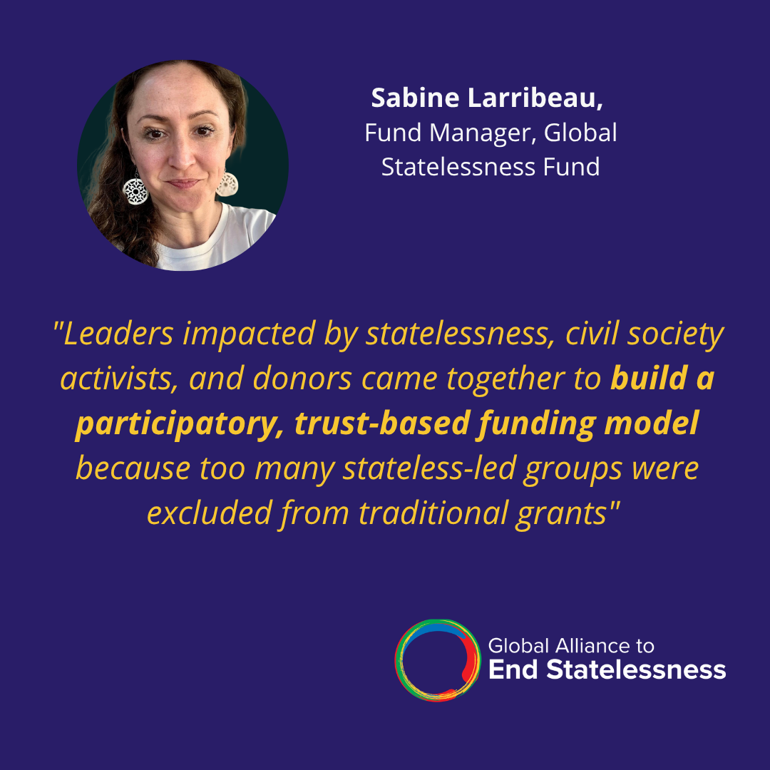 Sabine Larribeau, Fund Manager at the Global Statelessness Fund, highlighted the Global Statelessness Fund as a model that goes further by adopting a participatory, trust-based grantmaking approach. The fund was developed through collaboration among statelessness-impacted leaders, activists, and donors to provide unrestricted, multi-year funding. It also reduced bureaucratic barriers, such as lengthy applications, stringent reporting, and rigid due diligence, to ensure that smaller or stateless-led organizations can access critical resources. This approach strengthens equity in access to funding and amplifies impacted-person leadership.