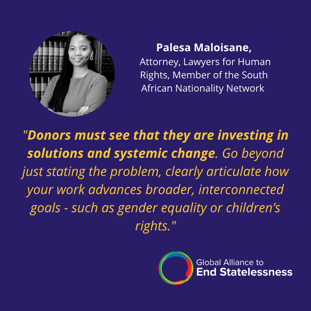All panelists emphasized the critical importance of core, multi-year funding, which allows statelessness-led organizations to sustain advocacy, maintain operations, and respond flexibly to evolving challenges.
