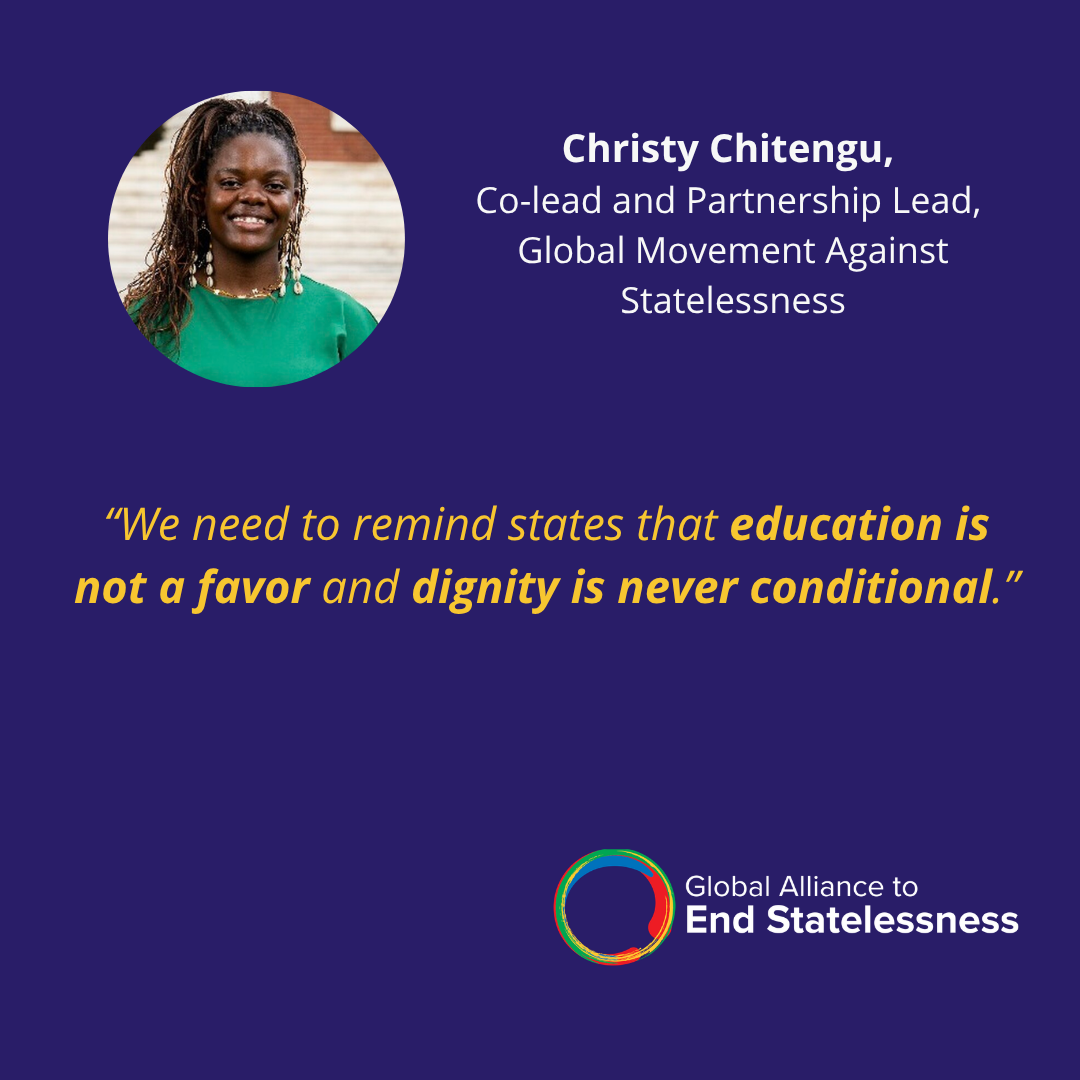 Christy Chitengu, Co-lead for Partnerships at the Global Movement Against Statelessness, began by sharing her lived experience as a stateless person from South Africa. She explained that, because of the country’s apartheid past, the constitution broadly guarantees the right to education—including for stateless people—but implementation remains far from straightforward. Administrative practices often create barriers, with schools requesting proof of identification mid-process—even when it wasn’t required at registration—effectively acting as gatekeepers rather than impartial facilitators.