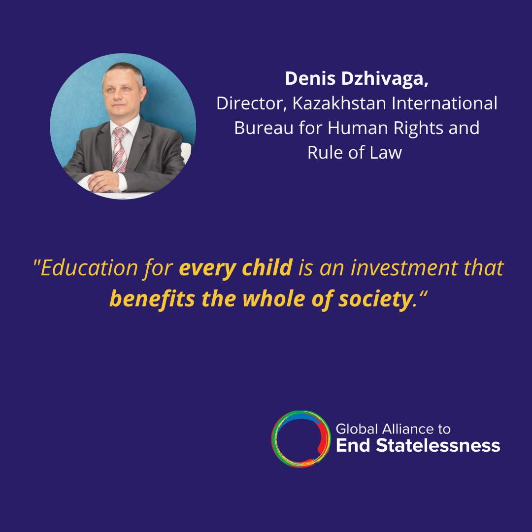 Denis Dzhivaga, Director of the Kazakhstan International Bureau for Human Rights and Rule of Law, affirmed that statelessness in Kazakhstan is not politicized, and all children—including stateless and undocumented—receive free education. He stressed the importance of cooperation between government agencies and NGOs to identify stateless children, facilitate their school enrollment, and address gaps in awareness among local officials through training and advocacy campaigns.